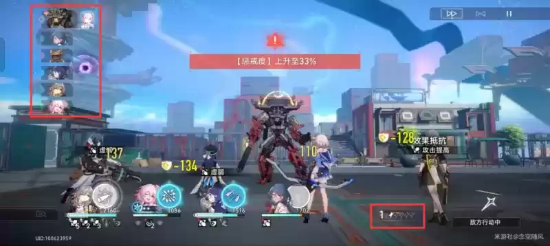 红框标注的就是最重要的部分,在它进行惩戒度积累的时候,不要用战技或者终结技去攻击任何一个敌方单位,但可以给护盾,回血