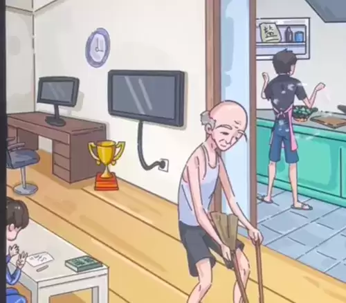 滑动屏幕就能看到爷爷,倒着拿扫把。