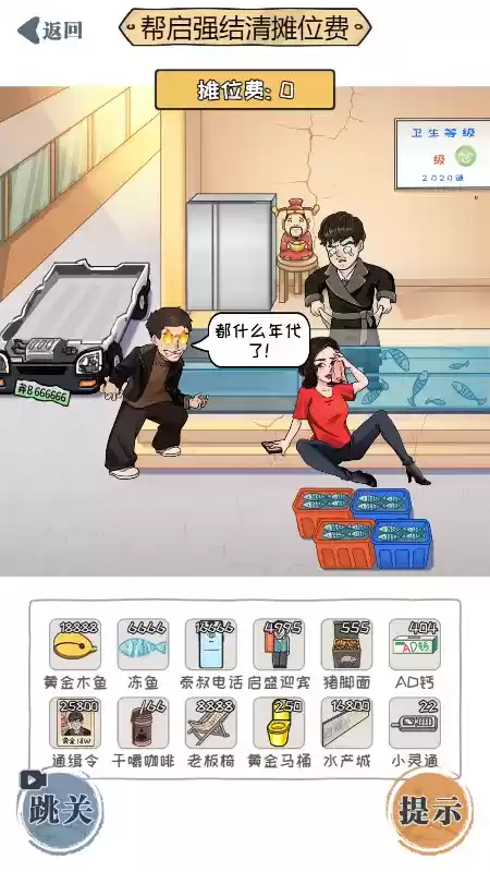 1、本关想帮启强结清摊位费,需要找到以下物品:黄金木鱼、冻鱼、泰叔电话、启盛迎宾、猪脚面、AD钙、通缉令、干嚼咖啡、老板椅、黄金马桶、水产城、小灵通