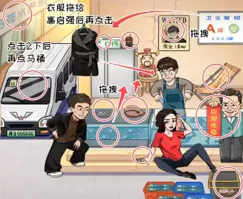 2、其中黄金木鱼要把木鱼拖到财神上三次后才会出现,冻鱼要把鱼拖到冰箱上等一会才能得到,AD钙需要把卫生等级的A字母拖到写着D钙的箱子上才能找到,通缉令需要把右边的大衣拖给启强穿上后才能点,黄金马桶要多次点击警车后才能看到