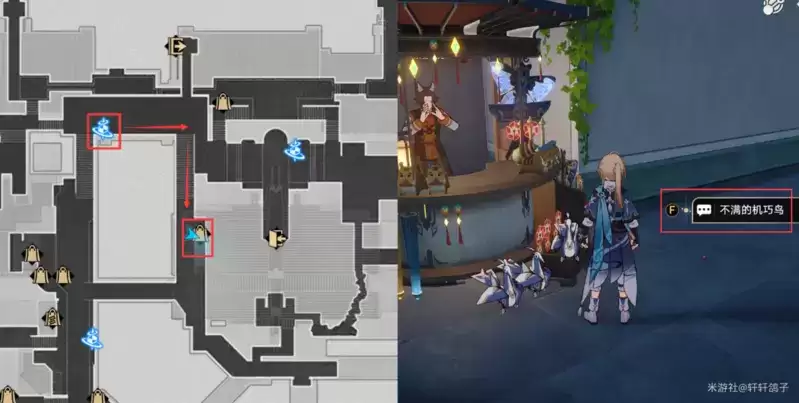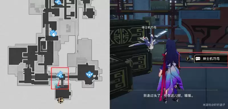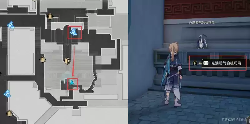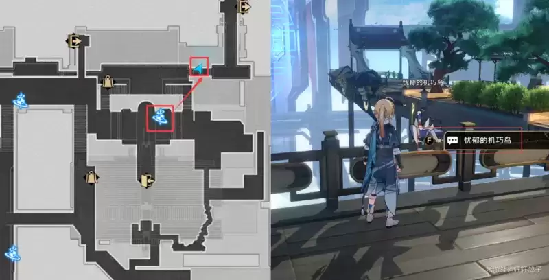 1)来到星槎海中枢如图所示的位置,与忧郁的机巧鸟对话。得到提示:寻找梓桥。