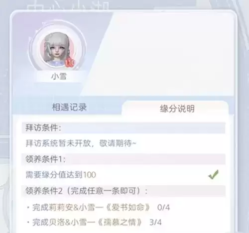 5、当缘分值达到100点,且完成《爱书如命》、《孺慕之情》任务后就可以领养小雪了。
