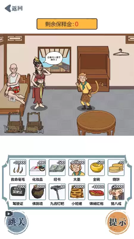 1、营救师傅这关需要找到下列物品来凑保释金:救命毫毛、化妆品、经书、大圣、金碗、烧饼、驾驶证、佛跳墙、九齿钉把、小短裙、锦斓红袍、猪八戒