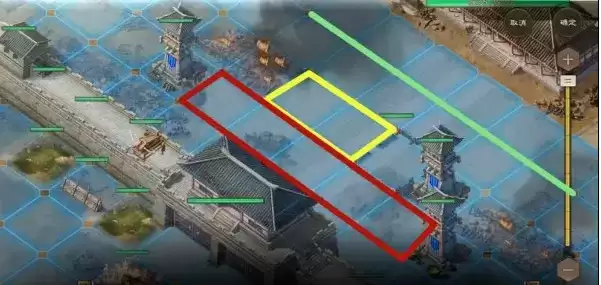 4、肉盾武将,考虑放置在城门后2格,如果对面是近战流派的话,可以考虑放置到城门后3格;如下图所示:绿线后为远程武将放置区域,黄框内为骑兵武将放置区域,红框内为肉盾型武将放置区域;