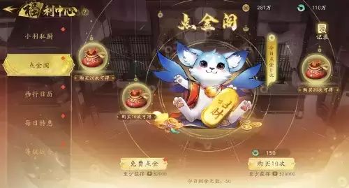 在点金阁中,西行者们可使用每日一次的免费点金机会,获得大量铜钱!同时,参与点金还有几率触发幸运翻倍奖励,更多惊喜在等你!而铜币作为游戏中的重要战略资源,当然是多多益善啦!