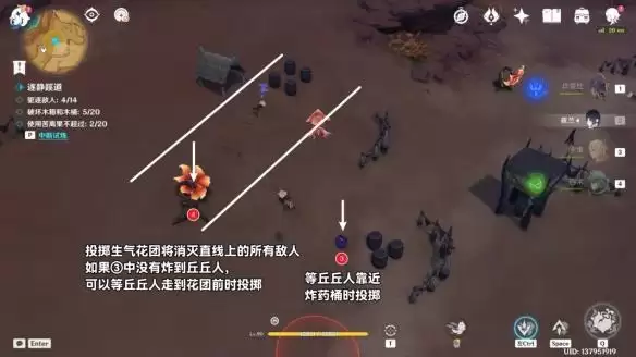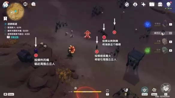 (1)试炼中,可以操纵斯露莎投放「苦离果」。「苦离果」命中场景中的不同物件后,将触发各种效果,影响附近的丘丘人…