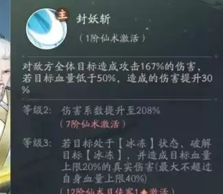 该角色在外观上非常霸气,使用一把威力极大的仙剑,主动技能伤害敌方全体单位,如果目标血量低于半血,则造成伤害提升。在仙术等级提升之后,如果目标处于冰冻状态,将冰冻状态直接破解造成一次真实伤害,数值非常可观。主动技能非常简单,就是极其单纯群体输出类型,用于压低血线。也可以在战斗后期利用伤害加成收割人头。