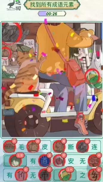 1、首先是进入关卡中,然后是知道这一关是需要找到所有的成语元素,也就是在图片中找到跟成语中缺少的字有关。