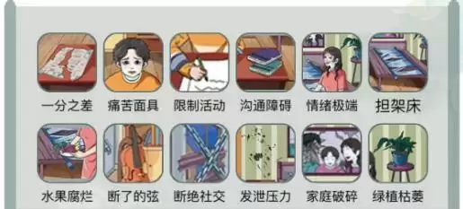 1、本关要找的12个细思极恐分别是:沟通障碍、情绪极端、担架床、发泄压力、一分之差、水果腐、烂断了的弦、断绝社交、痛苦面具、限制活动、家庭破碎、绿植枯萎