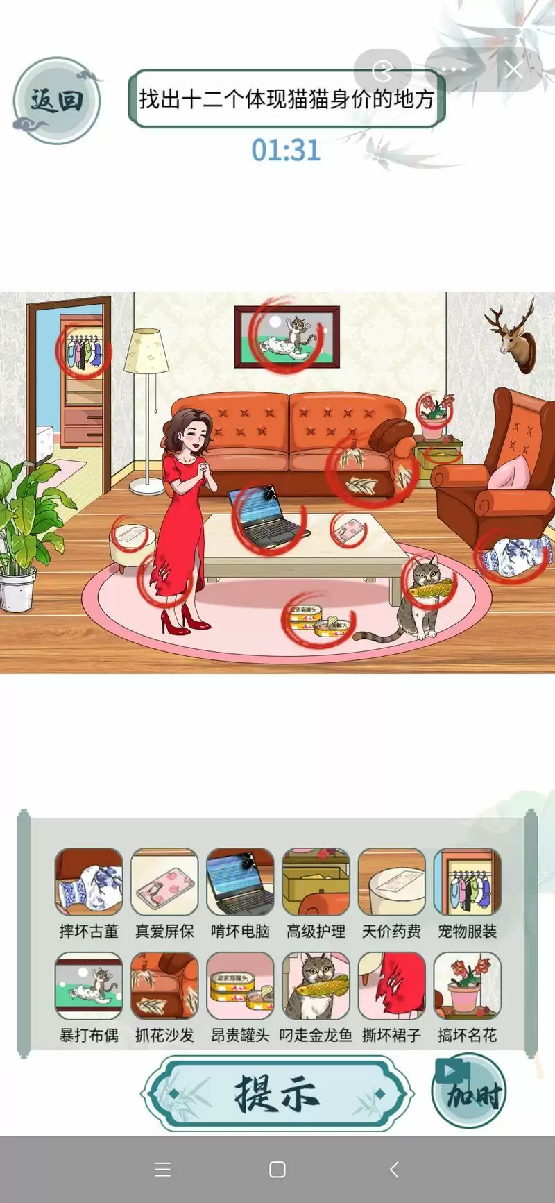 1、文字玩出花猫猫身价中要找的12个地方分别是:摔坏古董、真爱屏保、啃坏电脑、高级护理、天价药费、宠物服装、暴打布偶、抓花沙发、昂贵罐头、叼走金龙鱼、撕坏裙子、搞坏名花