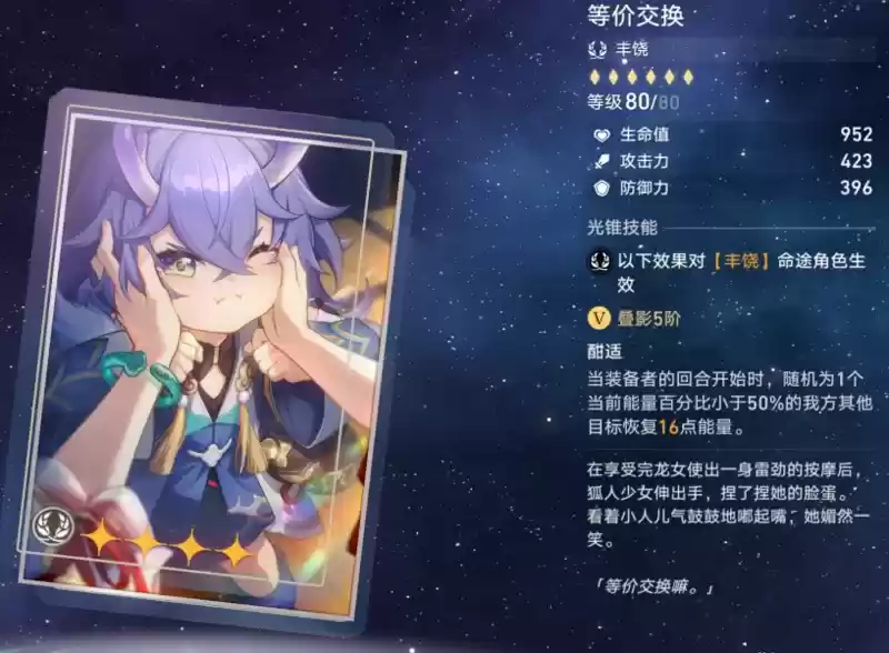 存护光锥:我们是地火,其特效为:战斗开始时,我方全体受到伤害降低8%/16%。同时为我方全体回复已损失生命值的25%/50%。伤害降低的特效能对友军起到不错的保护作用,但回血特效有些意义不明。但该效果只有五回合持续时间,在满星忘却之庭环境中倒是能全额吃满。而对于友军的保护,拥有嘲讽效果的光锥也能起到类似效果。