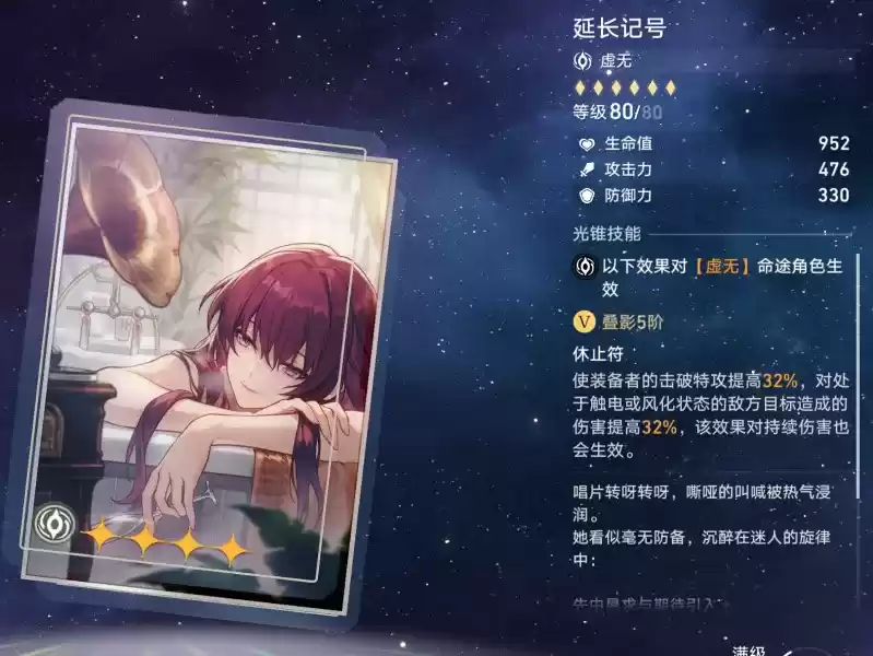 虚无光锥:延长记号,其特效为:装备者的击破特效提高16%/32%。对处于触电或风化的敌人造成伤害提高16%/32%,对持续伤害也会生效。
