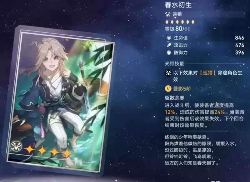 巡猎光锥:春水初生。其特效为:进入战斗和回合结束时,获得如下效果:速度提高6%/12%,造成伤害提高12%/24%。受到伤害后失效。速度和伤害的提升中规中矩,并不算非常突出。并且在受到攻击后效果还会丢失一回合,并不稳定。整体来看,春水初生的强度不足,不推荐换取。