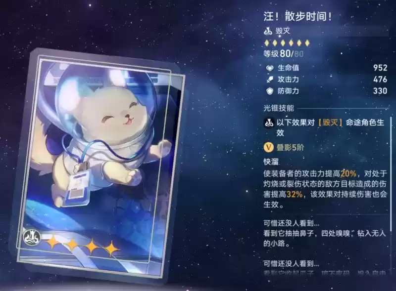 毁灭光锥:汪!散步时间!其特效为:装备者攻击力提升10%/20%,对处于灼烧或裂伤状态的敌人,造成伤害提高16%/32%。