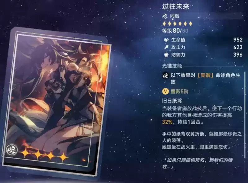 同谐光锥:过往未来。其特效为:装备者施放战技后,使下一个我方行动角色伤害提高16%/32%,持续一回合。非常适配布洛妮娅的四星光锥,满精时能提供高额单体增伤。在没有五星光锥且有布洛妮娅时,过往未来无疑是非常优秀的选择。而在给其他同协角色佩戴时,就需要考虑速度的调配问题。并且由于现阶段超强大C希儿的高速度特性,与该光锥调速极不适配(布洛妮娅除外)。由于其类似讨龙的特效,除非玩家可以完美调速,保证主C吃到增伤,否则不建议换取。有布洛妮娅且无布洛妮娅专武玩家,优先换取过往未来 (最高优先级)。