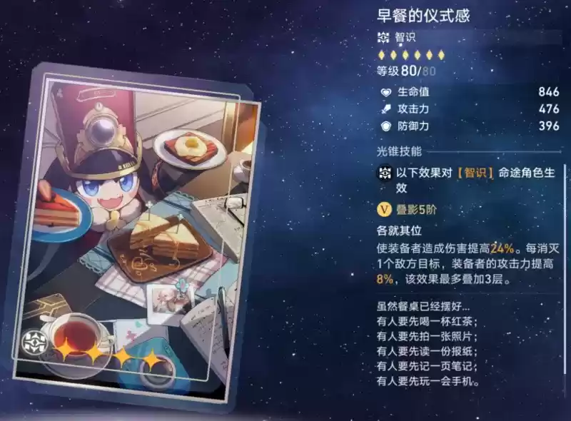 智识光锥:早餐的仪式感。其特效为:造成伤害提高12%/24%,每消灭一个敌人,攻击力提高4%/8%,最高叠加三层。满阶强度可观,击杀三个目标在现在多召唤物的环境下也并不难完成。并且特效通用,对所有智识角色都有不错的适配性。