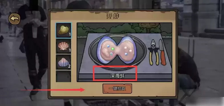 2·随后我们选择开蚌,这样就有很大的几率获得珍珠,点击一键拾取。
