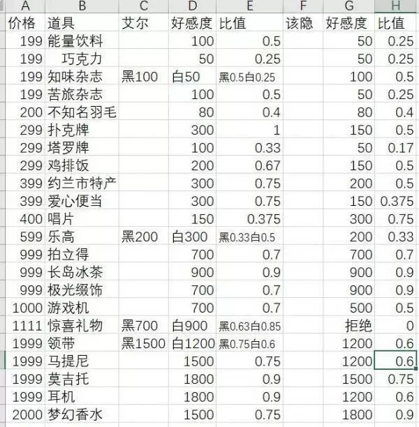 大部分的我买得起的都买了,如果游戏没更新新便宜的礼物,那这个表格直到存够钱买贵的礼物之前,应该不会再动了。