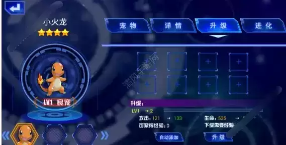 从主界面点击“队形”在上方导航栏(宠物、详情、升级、进化)中点击“升级”到达此界面。