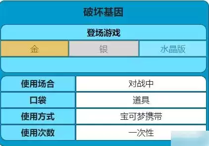 破坏因子是一种对战影响道具,破坏基因的非最新的常用译名为破坏因子、破坏的基因。破坏基因是众多道具中的其中一个,效果是出场后立即消耗,携带该道具的宝可梦陷入持续256(不清楚是分别指两次五次六次还是指两百五十六,待考证)回合的混乱状态并提升2级攻击,而战斗中使用包包里的道具仍然能够治愈这个道具引起的混乱状态。