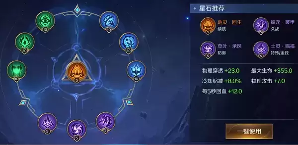 蓝绿星石*生命值、冷却缩减和物理穿透,提高猪八戒的消耗和生存能力。紫色星石推荐蛟龙,草叶,土灵,保证对线时更好的生存的同时,提升持续输出和更快的发育速度。橙色星石选择地灵,增加*大生命值,增强生存能力。