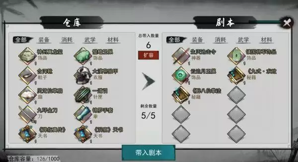 结算存档时,所有金色以上的装备(包括装备在角色身上的)、武功秘籍、天赋天书、道具,所有品质的传家宝将自动存入仓库。
