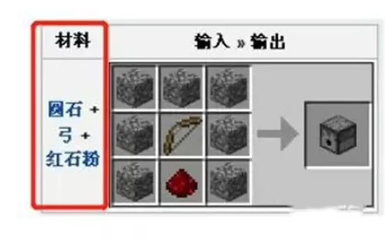 2、制作发射器的原材料是7个圆石、1把弓、1堆红石粉。