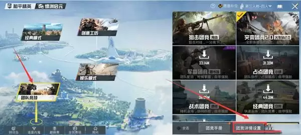 2、选择团队竞技玩法,点击右下角的团竞详细设置。