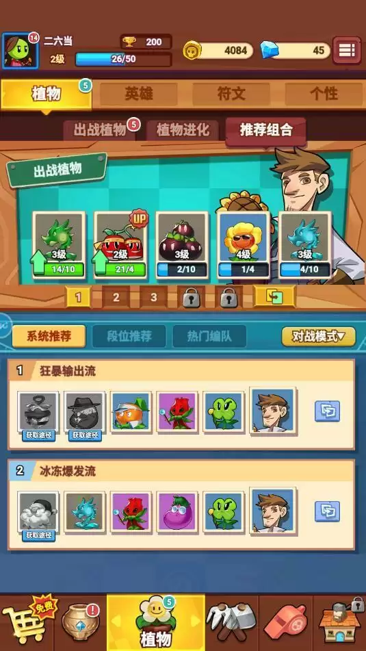 每个植物属性都是不同的, 我们需要合理搭配才能提升阵容的战斗力,系统提供了推荐组合,我们可以根据游戏推荐来搭配对应的植物,同时还拥有详细的获取途径供玩家参考。