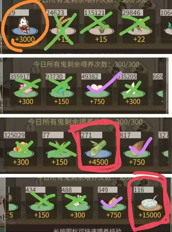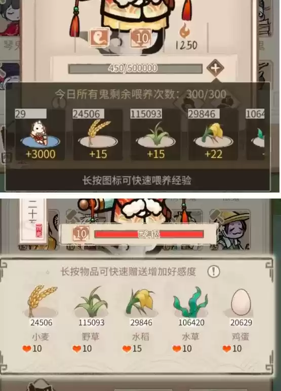 在开始提升一个鬼的等级值之前,先要把好感度拉满(喂一些多余材料就可以了)建议喂猪粪(话说这是从内测流传下来的传统吗),好感度可以加等级值送礼物的数值加50%,比如一个节日汤圆加1万经验,如果你你好感度满值就是15000的经验,数值还是相当可观的。