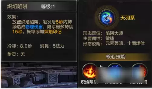 炽焰陷阱的主要作用是打伤害,释放之后可以对目标敌人造成高额的物理伤害,并且触发炽焰印记。cd为8秒,是我们主要的输出技能。