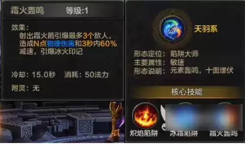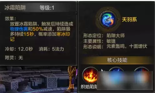 大招,选择霜火轰鸣就是为了配合冰霜陷阱与炽焰陷阱,我们都知道两个陷阱可以施加对应的印记,而大招就是为了引爆这些印记,是一个超级高的伤害,*多可以引爆3个敌人,并且附加百分之60的减速。