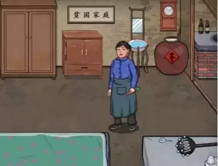 3.点击洗脸架上的镜子,滑动餐桌的左边,拖动锤子到贫困之家。
