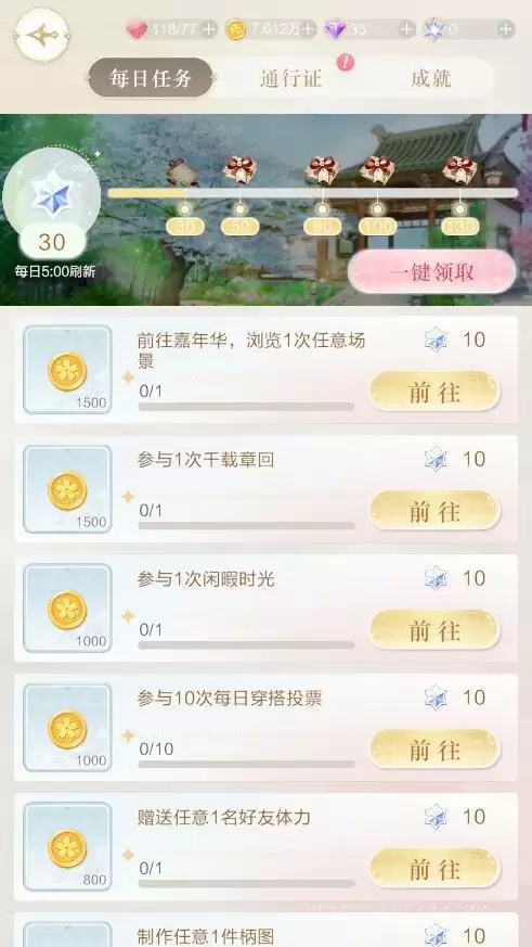3、进入到日常任务界面,我们可以通过每日任务和成就任务中的奖励来获取体力