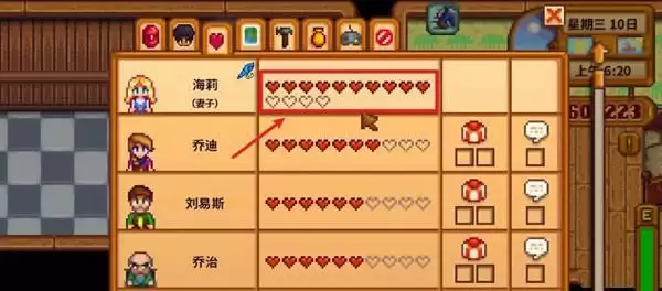 5、查看和配偶的好感度,要有10颗爱心才能触发生孩子剧情。