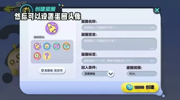 4、然后你就可以在这里填写:蛋圈名称、蛋圈宣言、蛋圈标签、加入条件、蛋圈规模;