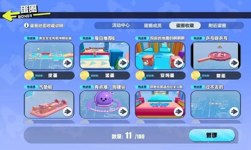 -蛋圈收藏:珍贵收藏分享给*好的朋友!蛋圈中所有蛋仔们收藏的地图将会在此展示,每位蛋仔*多5张地图,蛋圈内所有成员均可点击游玩!乐园地图挑花眼?不如看看大家的推荐吧!