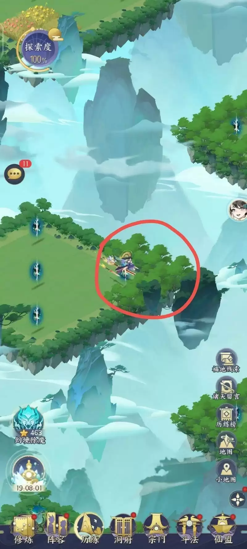 3、通关办法:一直走树多的传送口,如果分不清树多少,那就一直走“震”传送口,两种办法皆可。走完一遍就可以100%探索了。