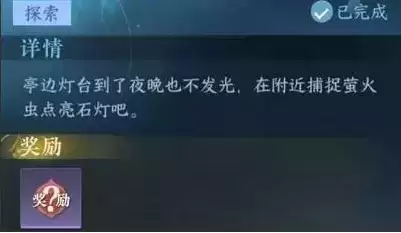 任务详情:亭边灯台到了夜晚也不发光,在附近捕捉萤火虫点亮石灯吧。