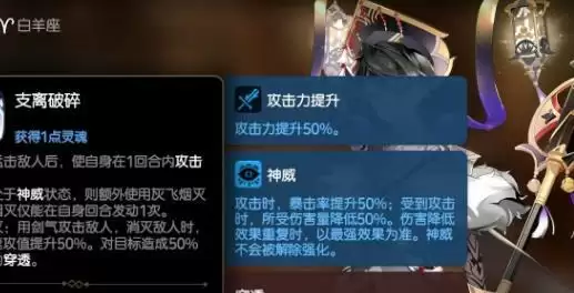 神威状态是极其有效的伤害提升效果,在攻击时暴击率提升50%,受到攻击时所承受伤害量降低50%,这样既有输出又有防御。而且是自身技能俯首称臣所能附加的状态,俯首称臣在攻击之后除了解除两个强化效果之外,还能造成一回合沉默,以及速攻值降低等影响,自身在三回合内获得神威效果。当消耗10点灵魂开启灵魂燃烧效果后,能够将目标身上所有强化全部解除,相当于直接将目标一切附加状态全部清零,这在很多战斗中都是非常有效的净化类作用。