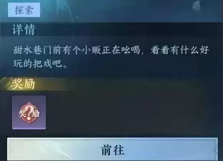 任务详情:甜水巷门前有个小贩正在吆喝,看看有什么好玩的把戏吧。