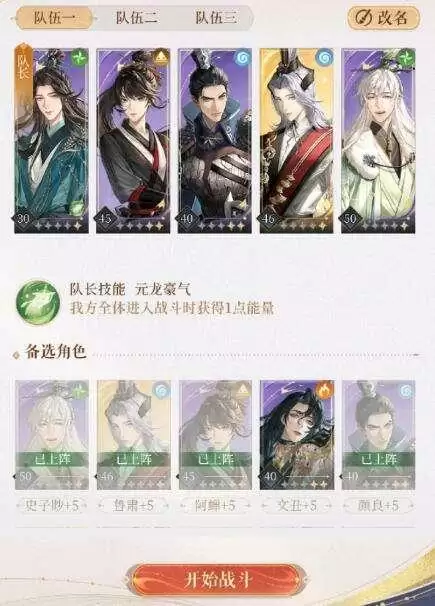 陈登30+3,蝉姐45+5,颜良40+5,鲁肃46+5,狮子喵50+5,陈登当队长,上阵时全体会加一点能量值,也就是说第二回合蝉姐、鲁肃和颜良就有大招了,不一定要这个组合,保证一盾一奶就好,蝉姐鲁肃陈登是关键。