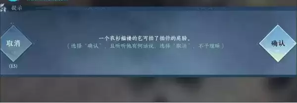 3、这时就会有一个衣衫褴褛的乞丐拍了拍你的肩膀,之后与他进行对话,他要啥你就给啥,对话结束后可以触发奇遇任务。(提示:如果没有乞丐拍你就继续乞讨。)