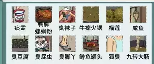 怀旧牛瘪答案:痰盂、鸭脚螺蛳粉、臭袜子、牛瘪火锅、九转大肠、榴莲、咸鱼、臭豆腐、臭屁虫、臭脚丫、鲱鱼罐头、狐臭