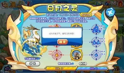 这里稍微注意一下,只有四次吸收日月之灵的机会,会有一个随机性:每次日月之灵点数是固定几个随机的(暂时不清楚有几个固定值),如果四次之内没把日灵和月灵平衡到50点则失败,不过可以反复重置直至达成!重置冷却时间:3分钟。重置后日月之灵点数依旧是随机的,大家可以根据实际情况进行加减。