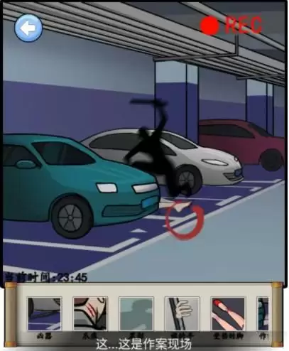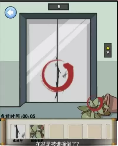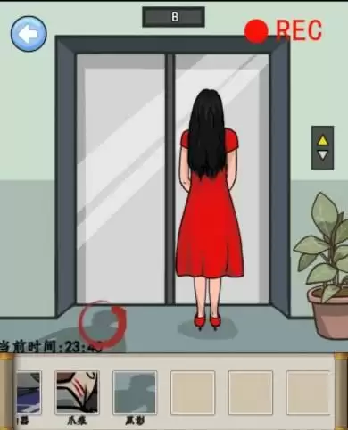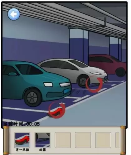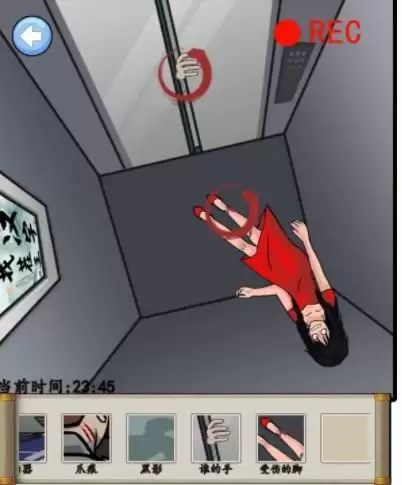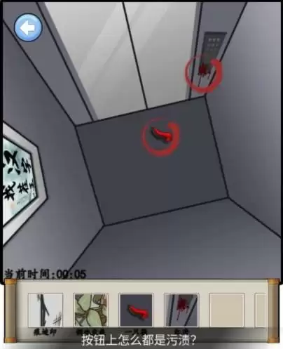 接下来,点击保安脖子,抓痕,随意切一个界面进入出来,发现保安不见了,点击红色倒退按钮,依次点击画面