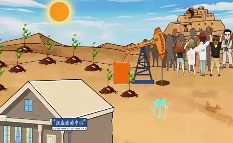 3、拖动强哥坐上去,挖出石油,来了个阿拉伯人投资,点击他,达成交易,拖动孔油桶到油井,装满拖到右上角,拖动放大镜到油桶和太阳中间,油桶爆炸,出现楼兰遗迹,拖动砖到草屋,变成砖房,拖动牌子到房子,变成旅游中心。