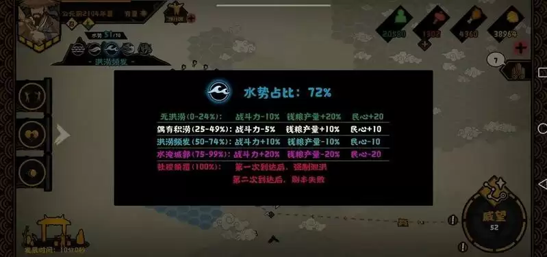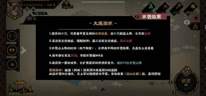 当前水位:受时间影响,随着游戏的进行,每年会发生洪涝,让当前水位增加5点。同时施行剧本政策或名臣政策,也可以增加或者降低水位。