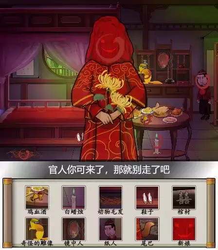 3、室内:点击动物毛发、鞋子、白蜡烛、鸡血酒、纸人、奇怪的雕像、镜中人、棺材