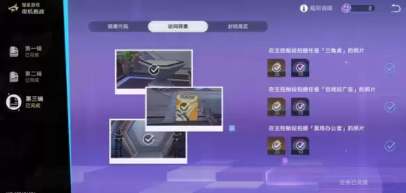 崩坏星穹1.1版本中的猎星游戏中的访问筛查第三辑是需要我们在主控舱段进行拍照,分别是三角桌、空间站广告、黑塔办公室3个地方进行拍照即可;